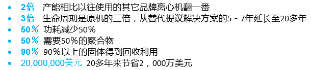 A4:能源节省、处理量增加,而工厂又无需建造新大楼,再结合离心机20多年的生命周期,加在一起 20 多年共可节省约 2,000 万美元。